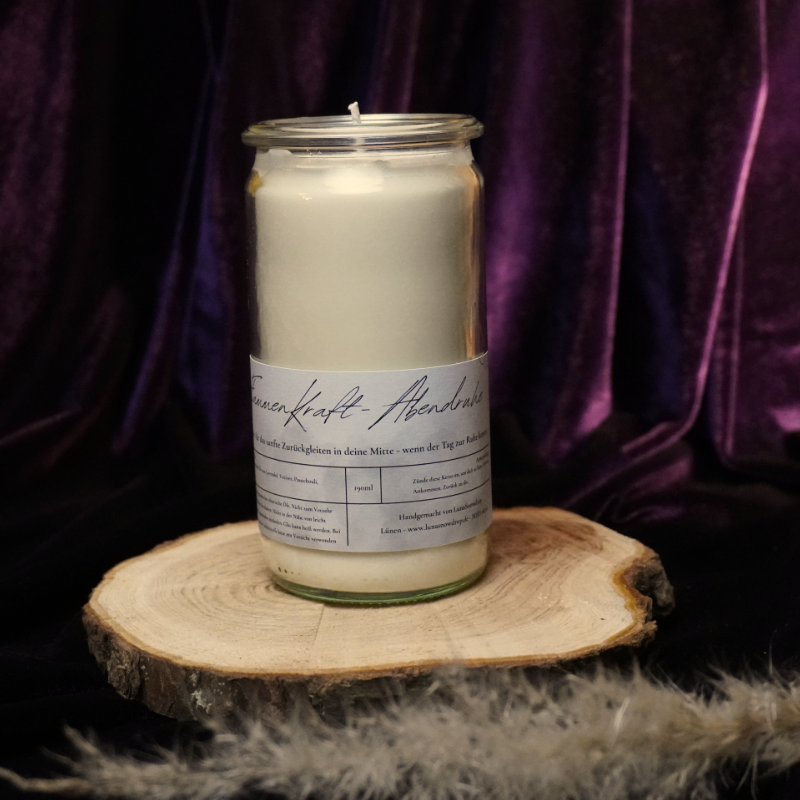 Eine handgegossene, vegane Ritualkerze für ruhige Abende. Erdend, entspannend und wohltuend – zum Loslassen und Ankommen.